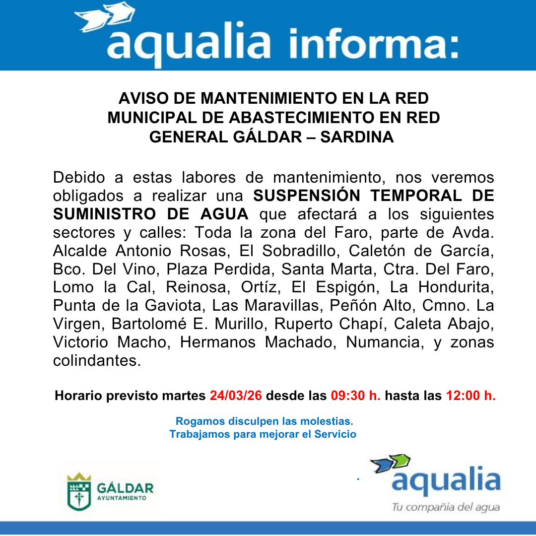 Aqualia informa de una interrupción temporal del suministro de agua por mantenimiento de la red general de Gáldar y Sardina