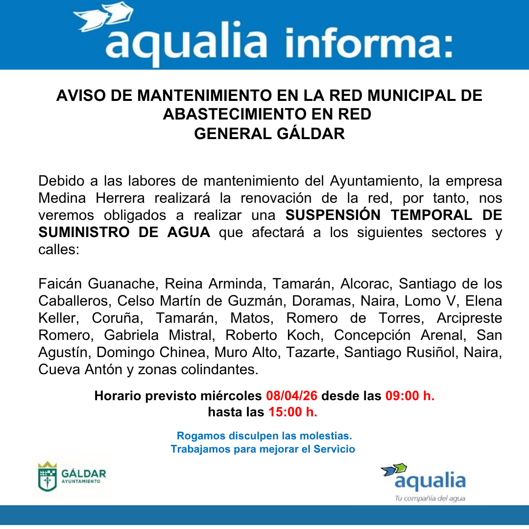 Aqualia informa de una interrupción temporal del suministro de agua por renovación de la red general de Gáldar