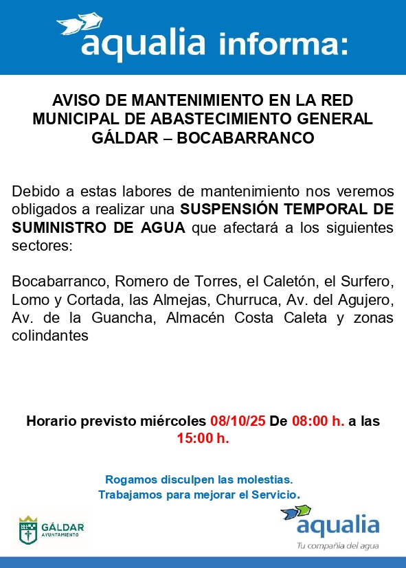 Aqualia comunica que, debido a trabajos de mantenimiento en la red general de suministro de agua potable en la zona de Bocabarranco, se efectuará una interrupción temporal del suministro de agua en la zona en la mañana de este miércoles 8 de octubre.