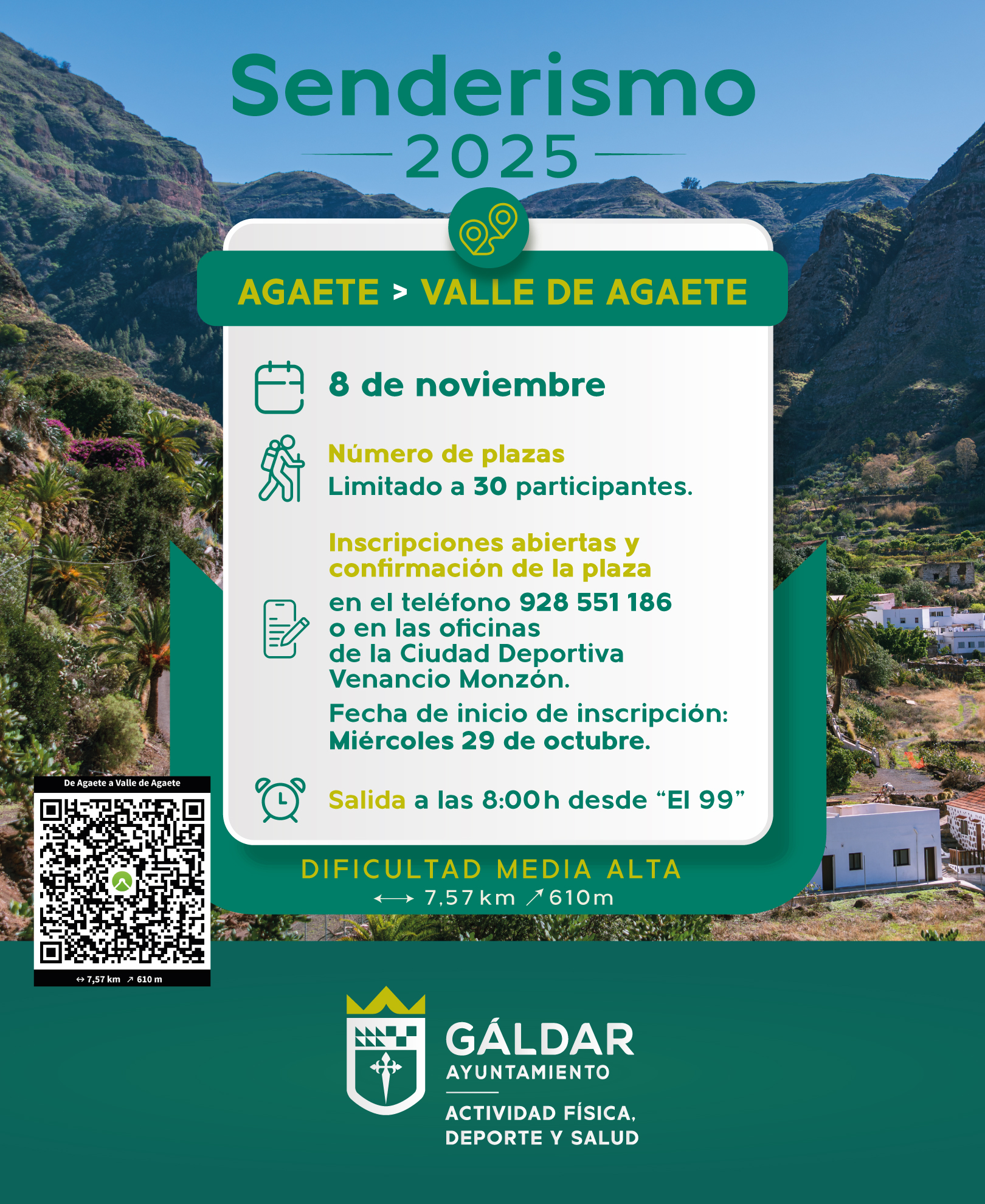 La Concejalía de Actividad Física, Deporte y Salud del Ayuntamiento de Gáldar continuará el sábado 8 de noviembre con el programa de Senderos 2025. En esta ocasión, se realizará una ruta desde Agaete hasta el Valle de Agaete, con un recorrido de 7,57 kilómetros y un desnivel de 610 metros, considerada de dificultad media-alta (ver código QR adjunto en el cartel).