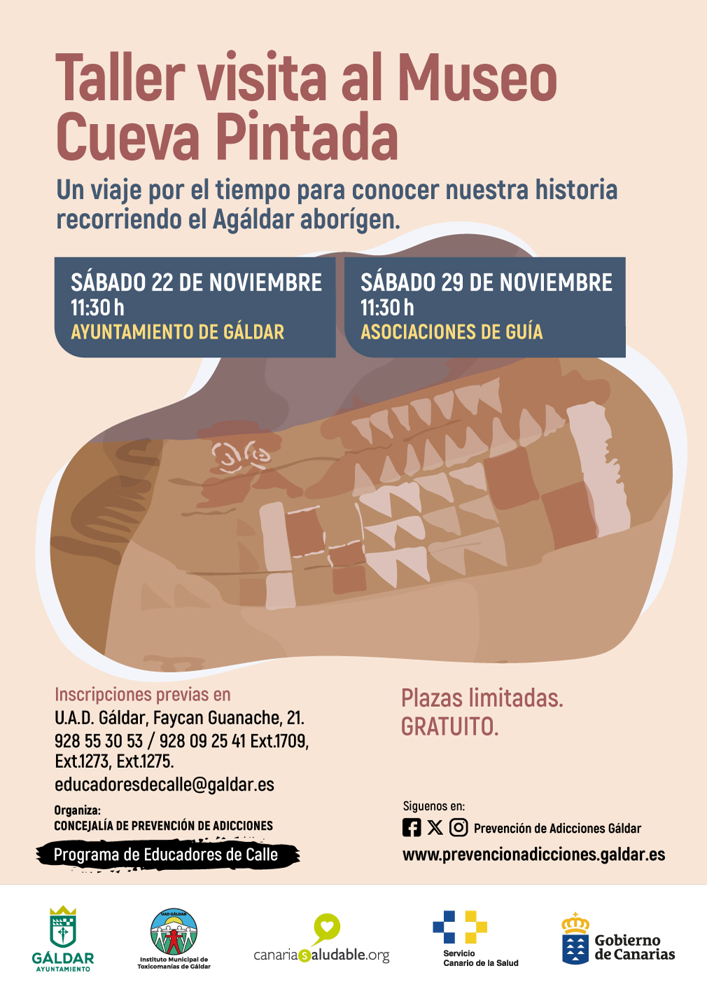 El Programa Educadores de Calle, adscrito a la Concejalía de Prevención de Adicciones del Ayuntamiento de Gáldar y dirigido por Nuria Esther Vega Valencia, organiza una visita guiada al Museo y Parque Arqueológico Cueva Pintada bajo el título ‘Un viaje por el tiempo para conocer nuestra historia recorriendo el Agáldar Aborigen’. Esta actividad busca promover el ocio cultural como herramienta de prevención, fomentando estilos de vida saludables y fortaleciendo la identidad local a través del conocimiento del patrimonio histórico y arqueológico del municipio.