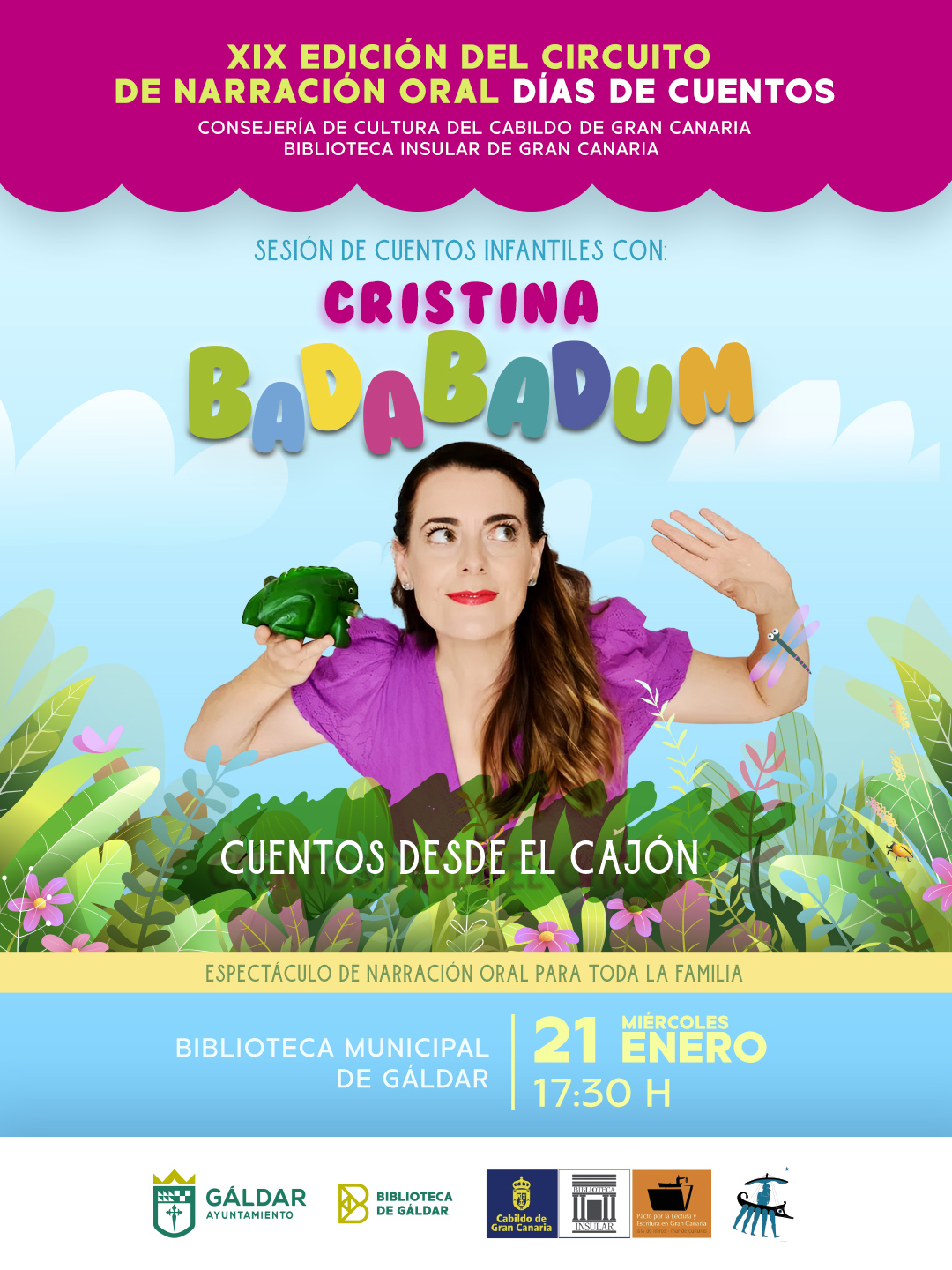 La Biblioteca Municipal de Gáldar acoge este miércoles 21 de enero a las 17:30 horas, el XIX Circuito de Narración Oral “Días de Cuentos” con “Cuentos desde el cajón”, una entrañable y creativa sesión a cargo de la narradora y pedagoga musical Cristina “Badabadum” Martín Sanz.