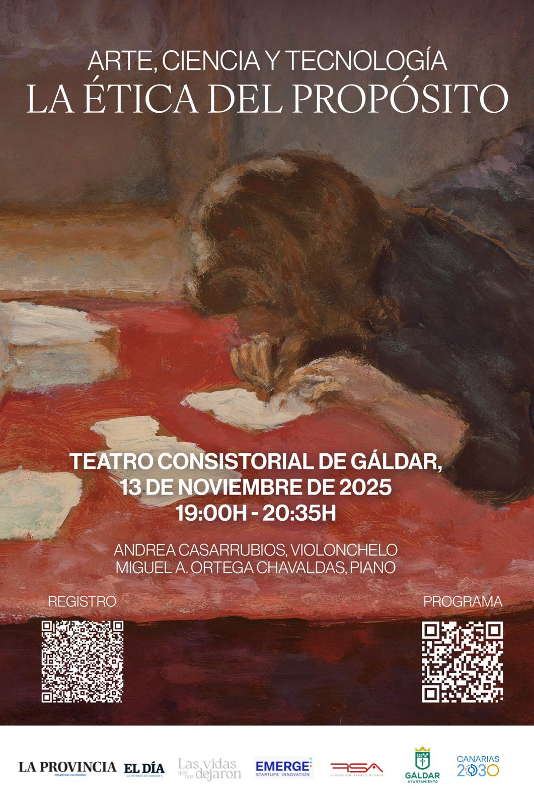 El Teatro Consistorial de Gáldar acogerá este jueves 13 de noviembre, a las 19.00 horas, la jornada “Arte, ciencia y tecnología: la ética del propósito”, un encuentro que combina creación artística, divulgación científica y reflexión ética en torno a los desafíos que plantea la inteligencia artificial en la sociedad contemporánea. El evento estará conducido por Nayra Moreno, directora de la Fundación Sergio Alonso, y la entrada será libre hasta completar aforo.
