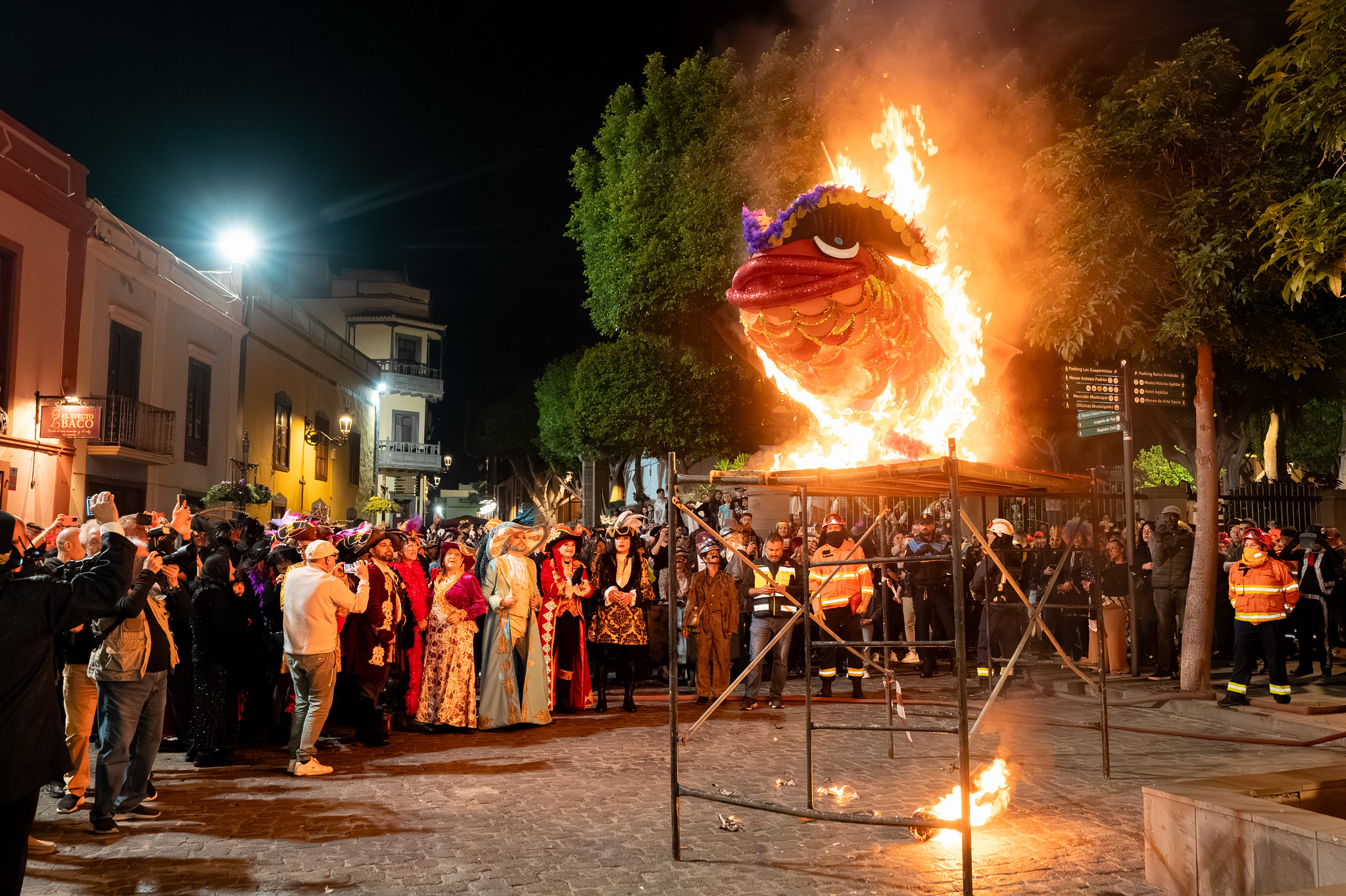 El alcalde de Gáldar, Teodoro Sosa, acompañado de la corporación municipal, era el encargado de la quema de la sardina ayudado por una de las pregoneras de este año, la “viuda del carnaval” Rita Ramírez.