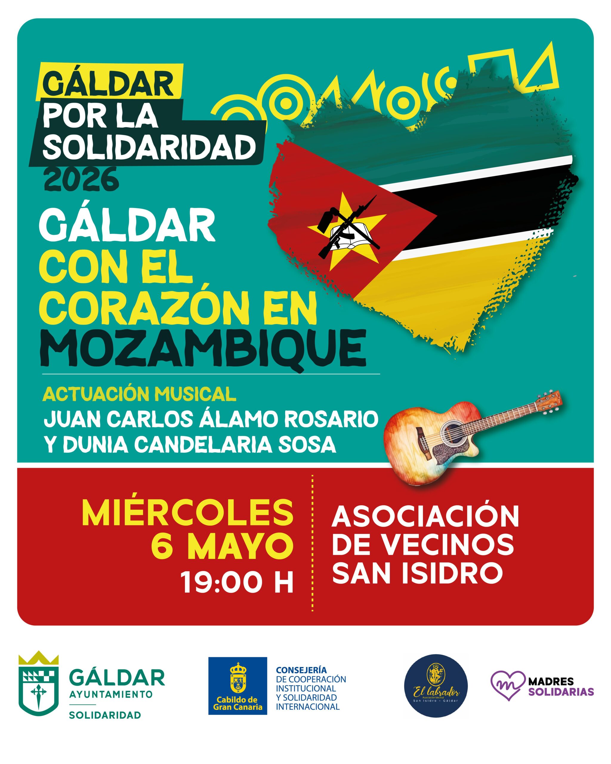 El Ayuntamiento de Gáldar, a través de la Concejalía de Solidaridad, que dirige Ana Teresa Mendoza Jiménez, organiza el próximo miércoles 6 de mayo a las 19.00 horas la gala solidaria ‘Gáldar con el corazón en Mozambique’, en colaboración con la AV San Isidro Labrador, que se celebrará en su sede en el marco de las Fiestas Principales de San Isidro.