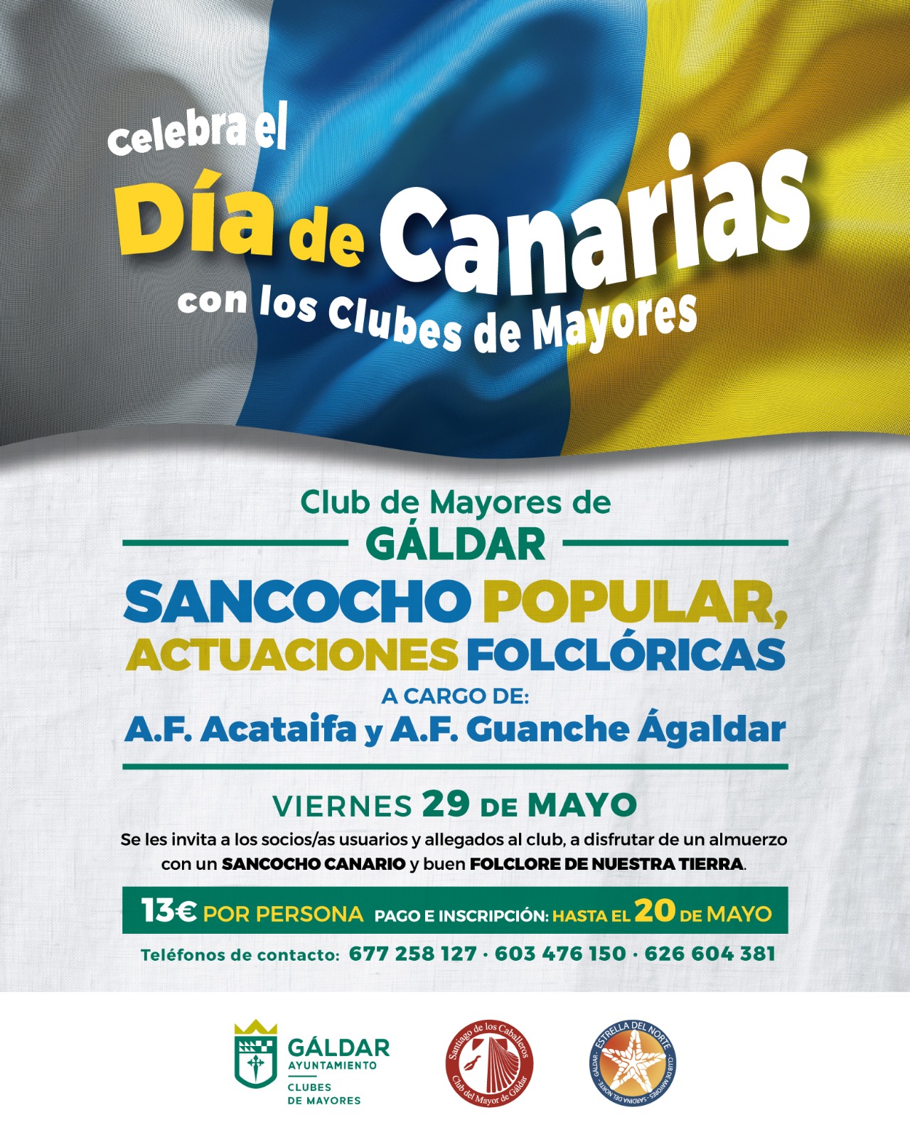 Los Clubes de Mayores del municipio conmemorarán el Día de Canarias el próximo viernes 29 de mayo con un gran sancocho popular que reunirá a socios, usuarios y allegados en torno a la gastronomía y la música. La jornada tendrá lugar en el Club de Mayores Santiago de los Caballeros, en Gáldar y dará comienzo a las 13:00 horas.