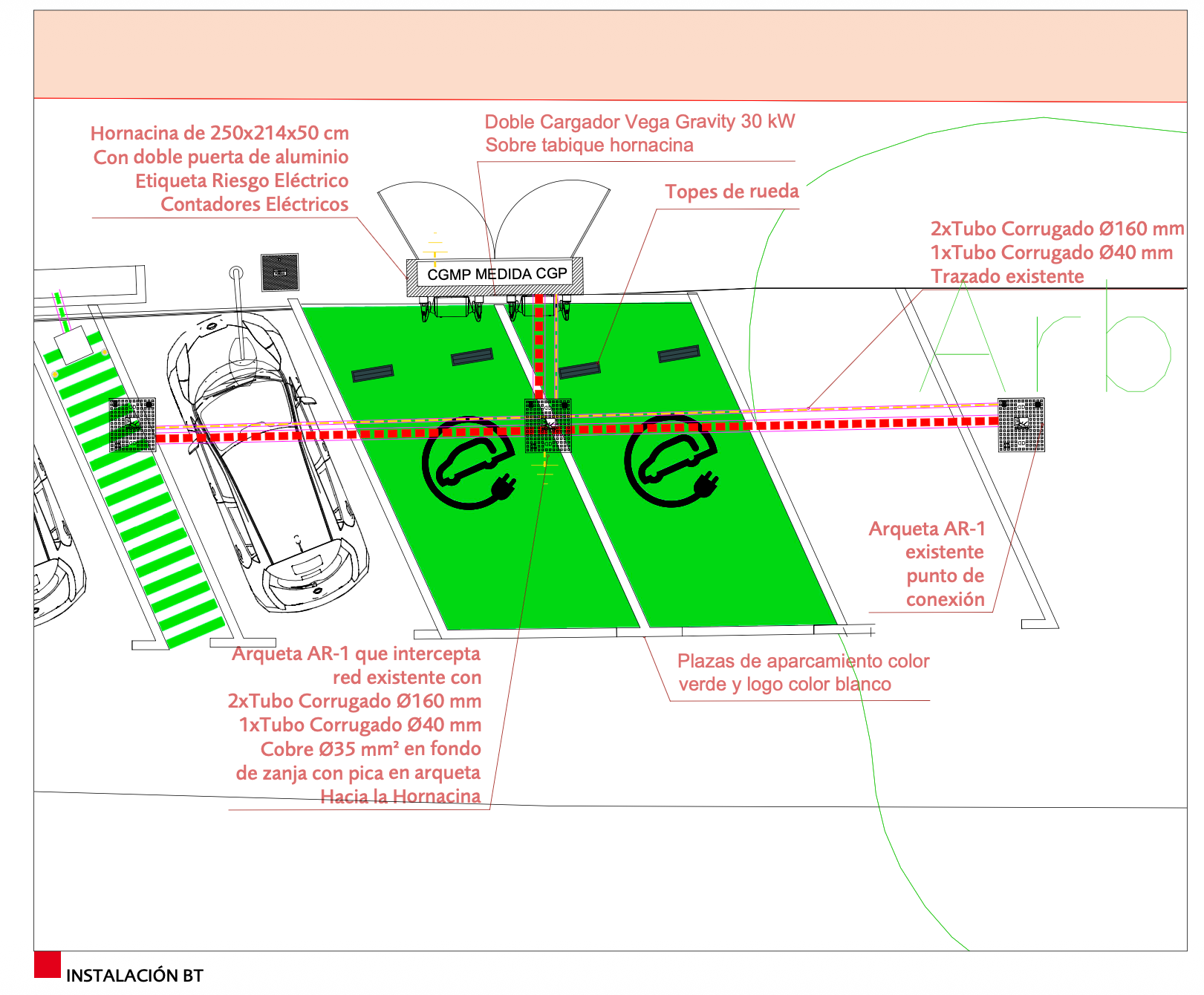 La actuación incluye la ejecución de un nuevo nicho para albergar las instalaciones de enlace eléctricas, el Cuadro General de Mando y Protección, los SAVE, y el acondicionamiento de las plazas de aparcamiento para la recarga (señalización vertical y horizontal).